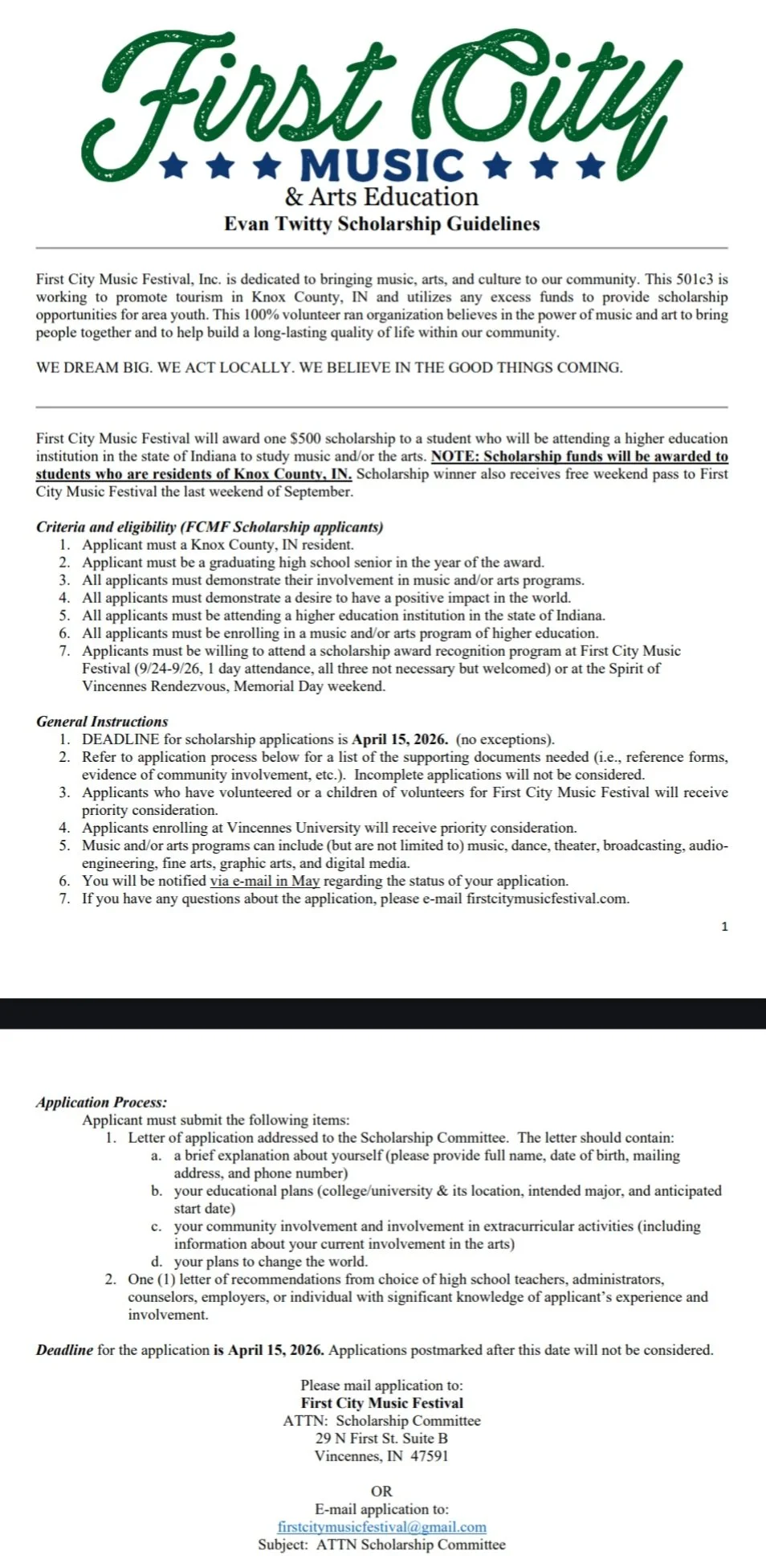Our young friend passed too early in 2020 and the First City Music Committee is proud to continue his legacy through the First City Music & Arts Evan Twitty Scholarship to help benefit Knox County youth continuing their study of music and the arts at a higher education institution in Indiana. Both Evan’s music talent and his larger than life smile and personality were blessings to our community and it is our hope that his legacy of sharing the fellowship of music will continue to be remembered through these efforts. First City Music is ecstatic to have the ability to offer ONE $500 scholarship to a Knox County youth for 2025. This scholarship is available to students of VCSC, Rivet, North Knox, and South Knox school districts, as well as home-schooled students